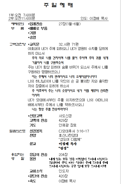 1.ÁÖÀÏ¿¹¹è, ¼ö¿äÀϹ㿹¹è´Â º»´ç¿¡¼ µå¸®°í, »õº®±âµµÈ¸´Â ¼Ò¿¹¹è½Ç¿¡¼ µå¸³´Ï´Ù. Á¤±â¿¹¹è¸¦ ºüÁöÁö ¸¿½Ã´Ù.