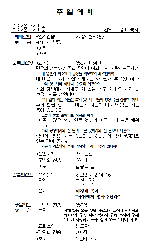 1.ÁÖÀÏ¿¹¹è, ¼ö¿äÀϹ㿹¹è´Â º»´ç¿¡¼ µå¸®°í, »õº®±âµµÈ¸´Â ¼Ò¿¹¹è½Ç¿¡¼ µå¸³´Ï´Ù. Á¤±â¿¹¹è¸¦ ºüÁöÁö ¸¿½Ã´Ù.