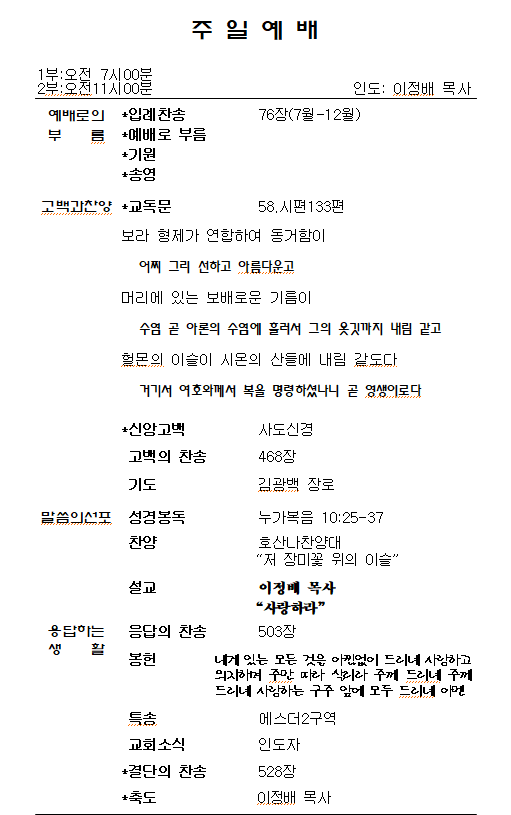 1.ÁÖÀÏ¿¹¹è, ¼ö¿äÀϹ㿹¹è´Â º»´ç¿¡¼ µå¸®°í, »õº®±âµµÈ¸´Â ¼Ò¿¹¹è½Ç¿¡¼ µå¸³´Ï´Ù. Á¤±â¿¹¹è¸¦ ºüÁöÁö ¸¿½Ã´Ù.