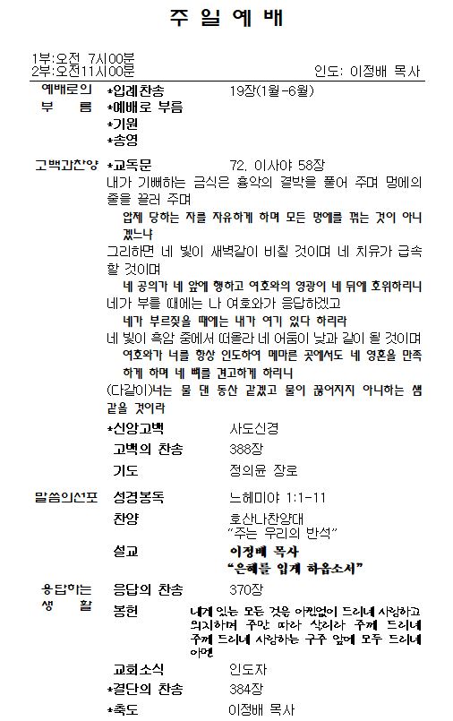 1.ÁÖÀÏ¿¹¹è, ¼ö¿äÀϹ㿹¹è´Â º»´ç¿¡¼ µå¸®°í, »õº®±âµµÈ¸´Â ¼Ò¿¹¹è½Ç¿¡¼ µå¸³´Ï´Ù. Á¤±â¿¹¹è¸¦ ºüÁöÁö ¸¿½Ã´Ù.