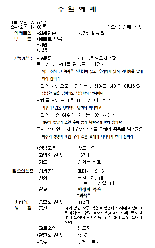 1.ÁÖÀÏ¿¹¹è, ¼ö¿äÀϹ㿹¹è´Â º»´ç¿¡¼ µå¸®°í, »õº®±âµµÈ¸´Â ¼Ò¿¹¹è½Ç¿¡¼ µå¸³´Ï´Ù. Á¤±â¿¹¹è¸¦ ºüÁöÁö ¸¿½Ã´Ù.