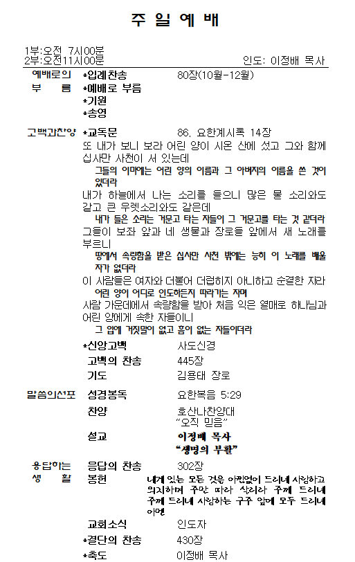 1.±¸¿ª¿¹¹è - ¿À´Ã ÁÖÀÏ 2ºÎ ¿¹¹è ÈÄ, 12½Ã 30ºÐ.