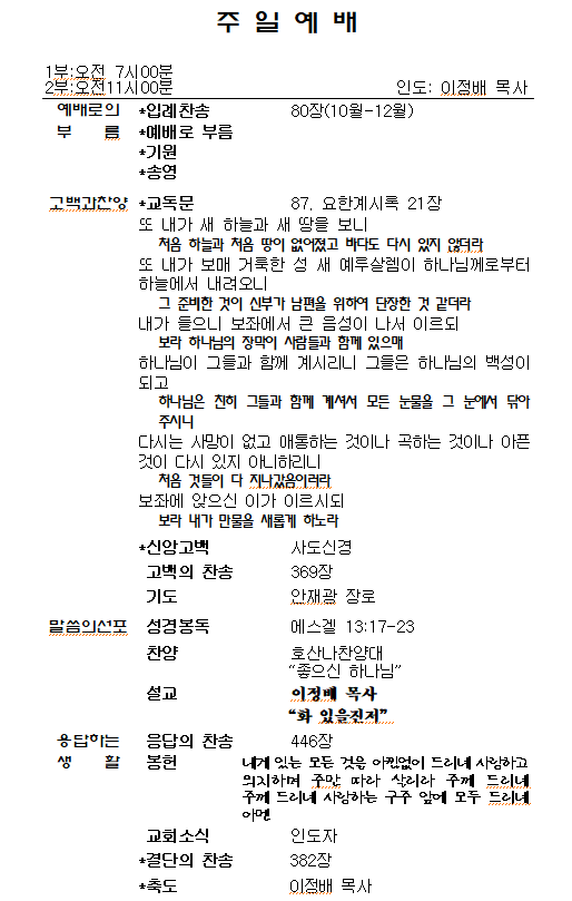 1.ÁÖÀÏ¿¹¹è, ¼ö¿äÀϹ㿹¹è´Â º»´ç¿¡¼ µå¸®°í, »õº®±âµµÈ¸´Â ¼Ò¿¹¹è½Ç¿¡¼ µå¸³´Ï´Ù. Á¤±â¿¹¹è¸¦ ºüÁöÁö ¸¿½Ã´Ù.
