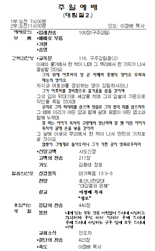 2.±¸¿ªÀå ¸ðÀÓ - ÁÖÀÏ 2ºÎ¿¹¹è ÈÄ, 12½Ã 10ºÐ ¼Ò¿¹¹è½Ç