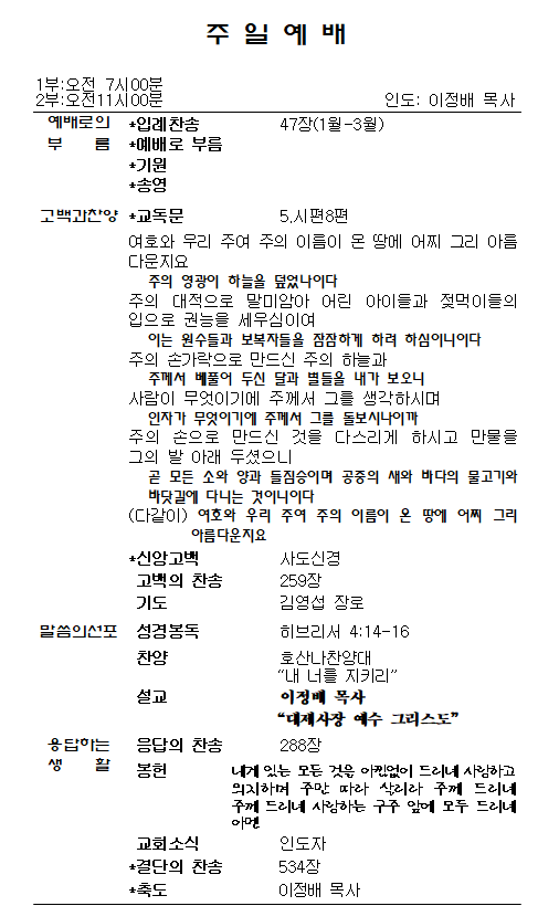 1.ÁÖÀÏ¿¹¹è, ¼ö¿äÀϹ㿹¹è´Â º»´ç¿¡¼ µå¸®°í, »õº®±âµµÈ¸´Â ¼Ò¿¹¹è½Ç¿¡¼ µå¸³´Ï´Ù. Á¤±â¿¹¹è¸¦ ºüÁöÁö ¸¿½Ã´Ù.