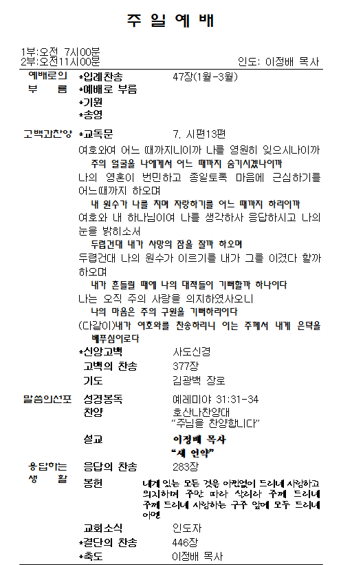 1.ÁÖÀÏ¿¹¹è, ¼ö¿äÀϹ㿹¹è´Â º»´ç¿¡¼ µå¸®°í, »õº®±âµµÈ¸´Â ¼Ò¿¹¹è½Ç¿¡¼ µå¸³´Ï´Ù. Á¤±â¿¹¹è¸¦ ºüÁöÁö ¸¿½Ã´Ù.