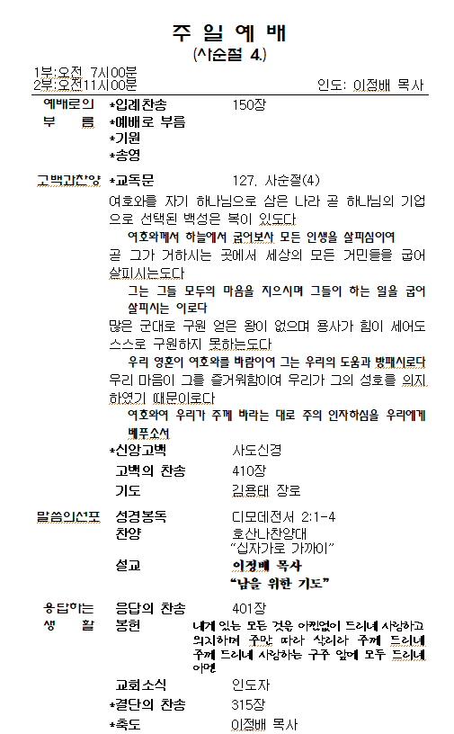 1.ÁÖÀÏ¿¹¹è, ¼ö¿äÀϹ㿹¹è´Â º»´ç¿¡¼ µå¸®°í, »õº®±âµµÈ¸´Â ¼Ò¿¹¹è½Ç¿¡¼ µå¸³´Ï´Ù. Á¤±â¿¹¹è¸¦ ºüÁöÁö ¸¿½Ã´Ù.
